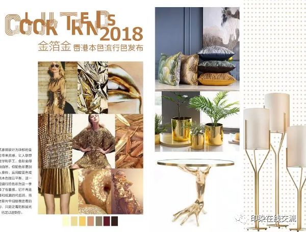 金色有很多,有偏绿色的金,也有偏红色的金。偏红色的色 有玫瑰金,我们定义为金箔金。这是2018年最主要的搭配色系。任何的家居空间,任何的家居元素,只要加入了这个金色就会显得非常的华丽、华贵,提升价值感。