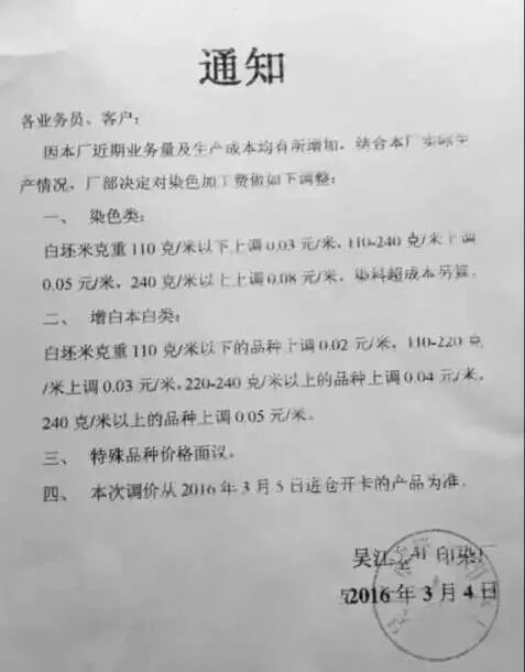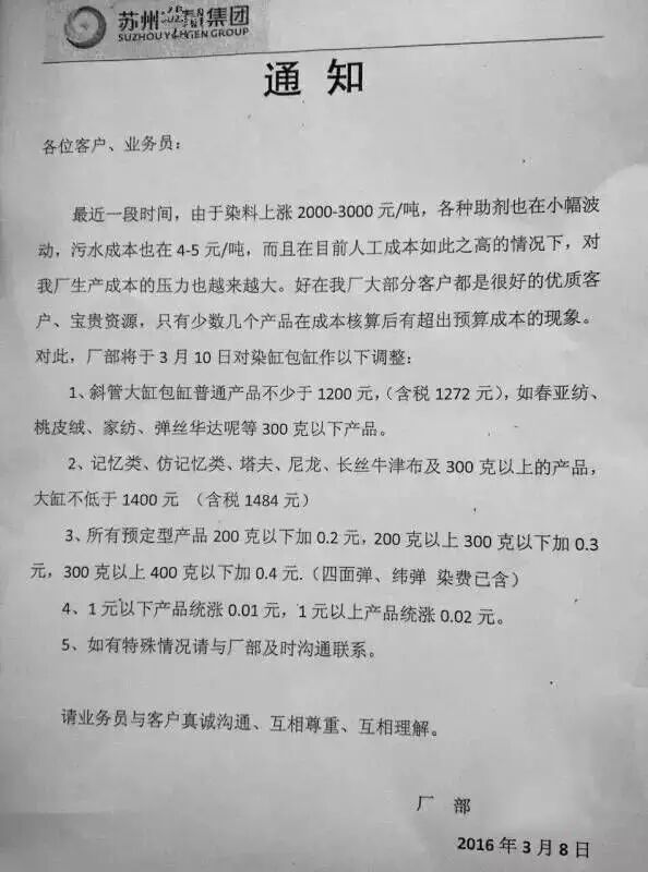 对此,厂部将于3月10日对染缸包缸作以下调整: 1.斜管大缸包缸普通产品不少于1200元,(含税1272元),如春亚纺,桃皮绒,家纺,弹丝华达呢等300克以下产品。 2.记忆类,仿记忆类,塔夫,尼龙,长丝牛津布及300克以上的产品,大缸不低于1400元(含税1484元) 3.所有预定型产品200可以下加0.2元,200克以上300克以下加0.3元,300克以上400克以下加0.4元。(四面 弹纬弹 染费已含) 4.1元以下产品通涨0.01元,1元以上通涨0.02元 因本厂近期业务量及生产成本均有所增加,结合本厂实际生产情况,厂部决定对染色加工费做如下调整: 一.染色类: 白坯米克重 110克/米以下上调0.03元/米; 110~240克/米上调0.05元/米; 240克以上上调0.08元/米,染料超成本另算。 二.增白类 白坯米克重 110克/米以下上调0.02元/米; 110~220克/米上调0.03元/米; 220~240克/米以上的上调0.04元/米 240克/米以上的上调0.05元/米 三.特殊品种价格面议 “涨价潮”蔓延至苏州 受绍兴74家印染厂停产整治和36家印染厂停产6天的影响,绍兴和萧山未列入整顿的印染厂生产和加工异常忙碌,由于来不及加工,染厂出现爆仓现象,不少开始停收白坯,交期大幅推迟,由正常的3-7天延迟至10-15天左右,部分超负荷运转的染厂交期到20天。 从去年江苏环保整治时部分印染往绍兴转移相同,绍兴的印染也同理是可以往江苏转移。虽然或许会提高一定的运输成本,但可以避免因生产销售非同期带来的库存贬值损失,并且运输成本可控性较贬值损失来的更为可控性。因此,有部分订单选择转移苏州,适逢印染传统旺季即将来临,染料巨头也纷纷试探性上调染料价格,环保成本增加等一系列因素影响,苏州印染企业综合考虑小幅上调染费。 因生产加工过于忙碌,染费陆续水涨船高,绍兴部分染厂涨价0.20-0.3元/米,根据产品情况个别涨价0.5元/米,主流涨幅在5%-10%,高的可达10%-20%,而苏州地区目前跟进涨价5%-10%。企业纷纷表示,目前还仅是试探性上调,后续还将视加工量和交期进度仍有提涨空间。