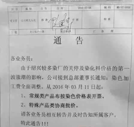 核心提示:整个市场因为绍兴停产整顿引发蝴蝶效应,不单单在绍兴这个风暴眼,现在已经蔓延到长三角。印染旺季的来临,染料助剂开始涨价,绍兴染厂上涨染费,面料商开始恐慌。据消息从苏州地区印染企业获悉,由于绍兴较多染厂关停及染化料价格的第一波涨潮影响,业务量及生产成本均有所增加,印染企业压力也越来越大。为正常维护企业的健康稳定发展,对印染加工费进行小幅上调,幅度为5%~10%左右。