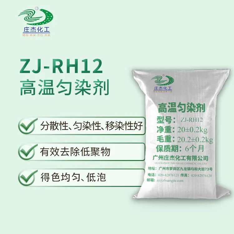 ZJ-RH12高温匀染剂是庄杰化工开发的一款以特种表面活性剂为主要成分的涤纶织物高温高压染色用匀染剂,对分散染料具优良的染料分散性,初期缓染性,移染性,不消色、低泡等特点。