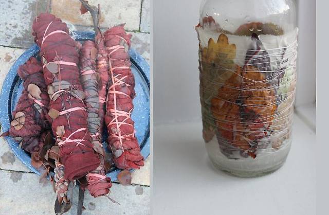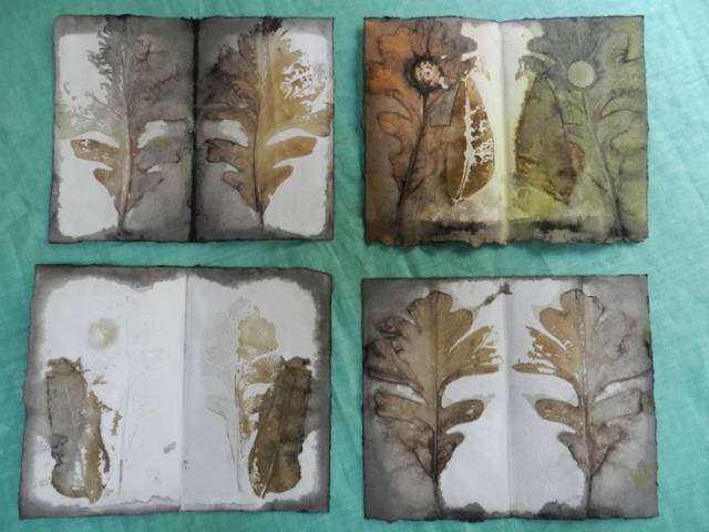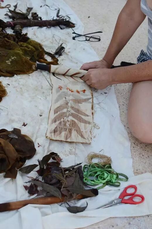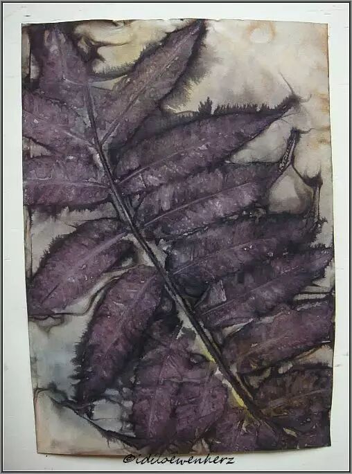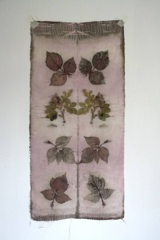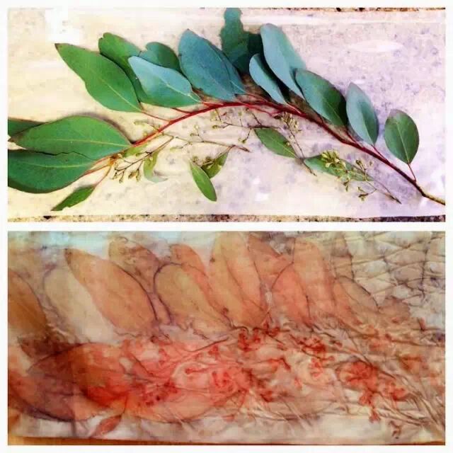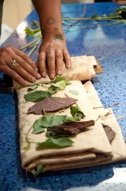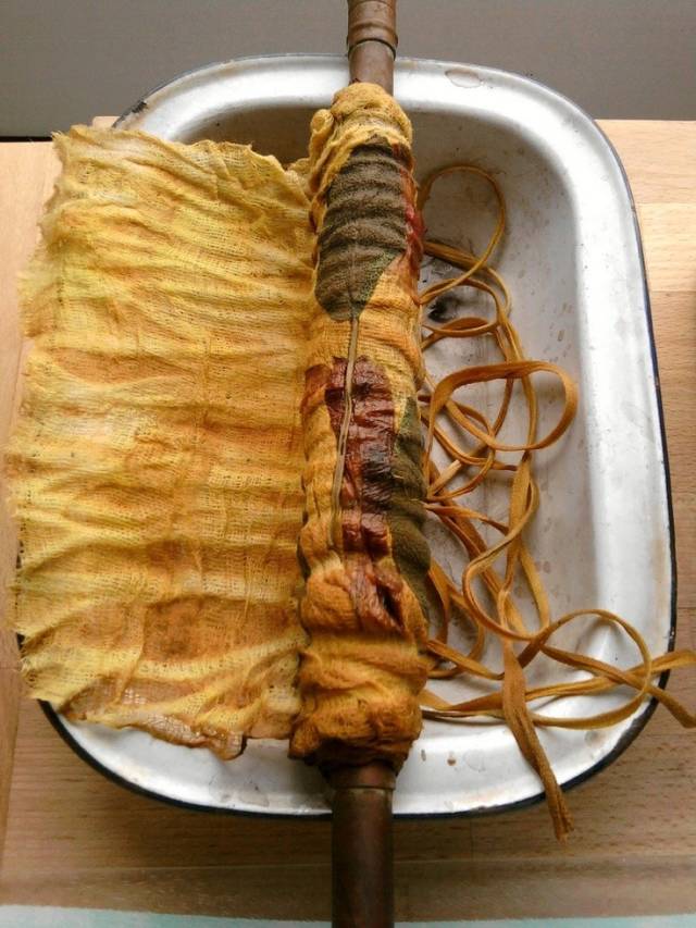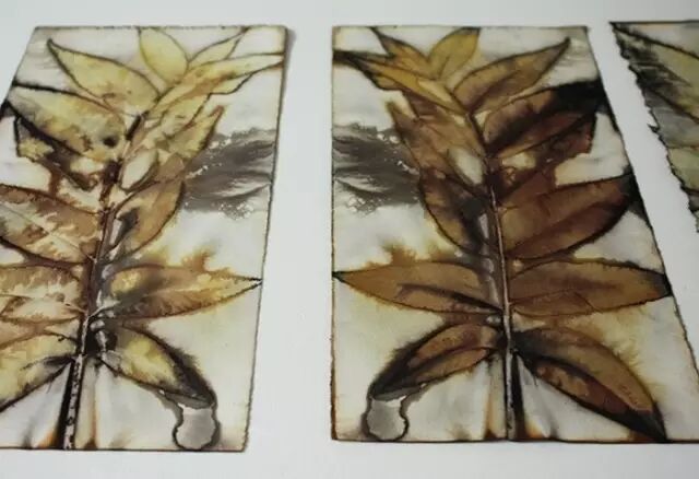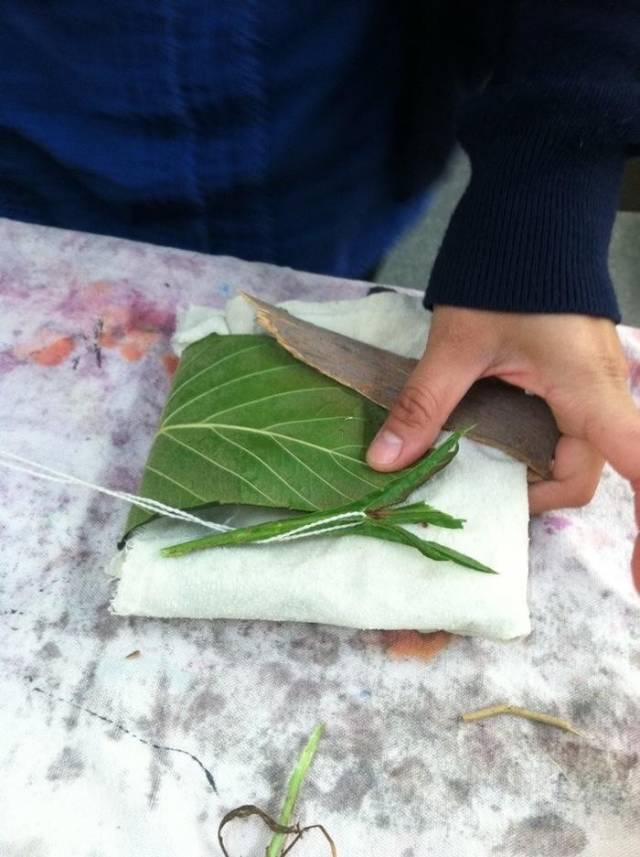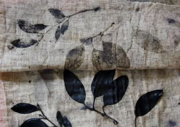 在植物染色中,有一种神奇的“印刷术”,可以将实物(植物、金属器件、染色的布料等)的颜色和形状通过加温或蒸或煮,并利用媒染进行助染固色印制到布料、纸张及皮质的工艺,可以称之为:“转印染”。