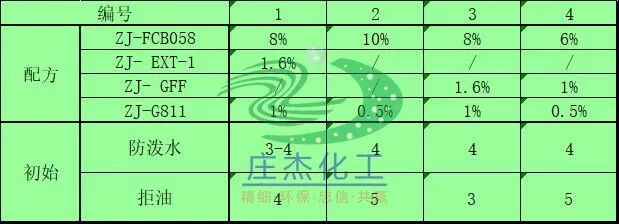 由1-4号配方工艺可看出, 加工整理的棉拉架面料样本防水性能均可满足防泼水4级,防油4级的预期指标,适量加入ZJ- GFF防水整理用交联剂整理效果更佳。