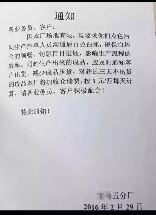 因本厂场地有限,现要求你们点色后同生产排单人员沟通后再拉坯布,确保白坯仓的顺畅……减少成品压货,对超过三天不出货的成品,本厂将加收仓储费,按1元/匹每天计算。
