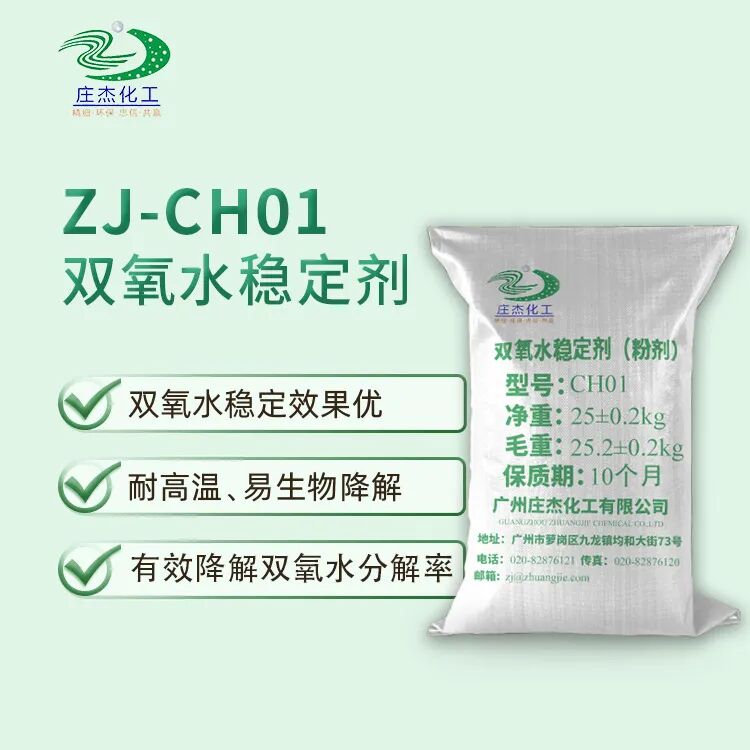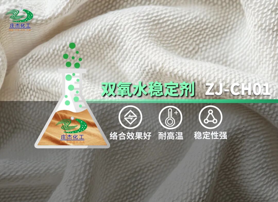 然而,在碱性条件下,双氧水的分解速度会加快,这不仅会降低其漂白效果,还可能对织物造成损伤。此外,水中的重金属离子如钙、镁、铁、铜等也会催化双氧水的分解,影响漂白效果,并可能导致纤维强度下降和织物出现破洞等问题。 为避免这些问题的产生,染整加工厂往往会在漂白工序中加入双氧水稳定剂,以抑制双氧水的快速分解。那么在棉织物的氧漂过程中,双氧水稳定剂的作用是什么? ZJ-CH01双氧水稳定剂主要作用 双氧水稳定剂在棉织物的氧漂过程主要是为了解决双氧水在漂白过程中容易分解的问题,保护纤维不受损伤,并提高漂白效果。ZJ-CH01双氧水稳定剂是庄杰化工开发的一款以有机羧酸与特种辅助剂复合体为主要成分的双氧水稳定剂。 稳定效果优:氧漂稳定剂通过与水溶液中的铁、铜、铝、镁、钙等金属离子结合,形成络合物,从而有效防止这些金属离子对双氧水的催化分解,保证纺织品在双氧水漂白过程中能够平稳进行 良好的络合分散作用:对铁、铜等金属离子良好的络合作用,能有效防止织物在漂白中产生损伤及破洞,与络合分散剂同时应用时能明显增进络合分散剂的分散效果 提高漂白效果:使用氧漂稳定剂可以提高纺织品的白度和亮度,使漂白效果更加显著 清理杂质:该助剂有阻垢效果,有利设备清洁,保持漂白液的清洁和稳定 耐高温:在较宽PH范围内稳定 ZJ-CH01双氧水稳定剂用本产品制造氧漂稳定剂为一种耐高温、耐强碱、抗氧化的新型非硅氧漂稳定剂,主要用于棉、麻、人造棉及其与化纤混纺等产品的前处理氧漂工序中,对双氧水的稳定作用超过硅酸钠,且不会产生难以去除的“硅垢”,织物氧漂后白度高、手感柔软。